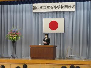 常石小学校は閉校となりますが,これまで培ってきたコミュニティと絆が今後も引き継がれ,未来に向けて発展していくことを願ってあいさつとさせていただきます。
