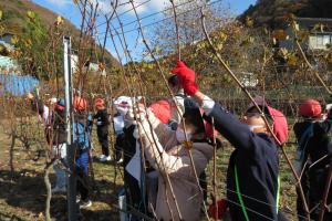 ブドウ畑では,ブドウの木の剪定作業を体験しました。はじめは恐る恐る作業していた子どもたちでしたが,次第に慣れてくると「楽しい!」「先生ここは切っていい?」と剪定できそうな枝を見つけては嬉しそうにはさみを入れていました。