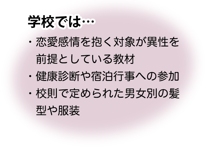 カミングアウト(自分自身のセクシュアリティを打ち明けること)したら「からかわれるのではないか」「言いふらされるのではないか」など、差別や偏見を恐れて悩んでいます。また、日常生活のさまざまな場面でも困難を抱えています。具体的には次のような悩みがあります。